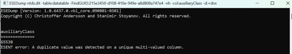 But let’s try a DIT from Windows Server 2022 (8k) on Windows Server 2025 🙂 We’re thrown out with ESENT error: A duplicate value was detected on a unique multi-valued column.