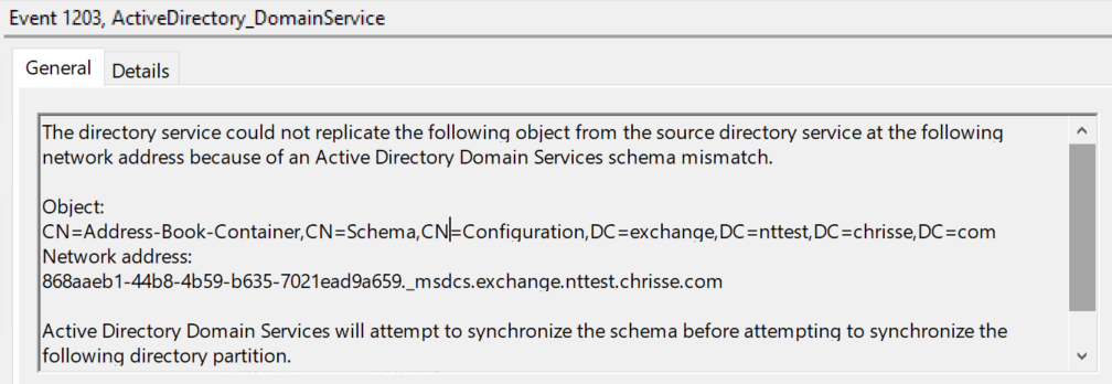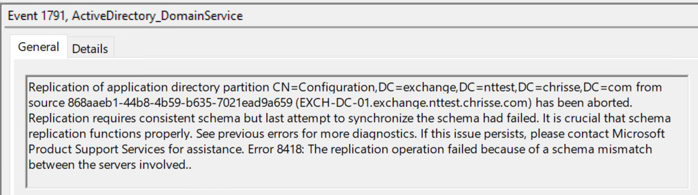 So what is going on here – a bad exchange schema upgrade that would cause replication to fail? At first you can think that would be the case – it’s NOT according to me, but I would hold on that the exchange schema upgrade do something bad [1] – let’s get back to that later.