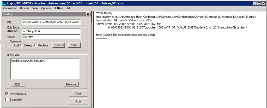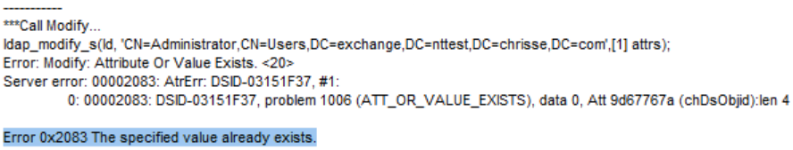 Attributes with the syntax 2.5.5.2 aka String(Object-Identifier) suddenly takes duplicates – here it’s time to tell what exchange is doing bad [1] – Exchange adprep never check if a value is already present in those attributes, instead on each update (CU/Release) it’s trying to add the same value again, relaying that AD throw’s them out with ATT_OR_VALUE_EXISTS – below we can see how that works when the Schema – FSMO is held by a Windows Server 2008 R2