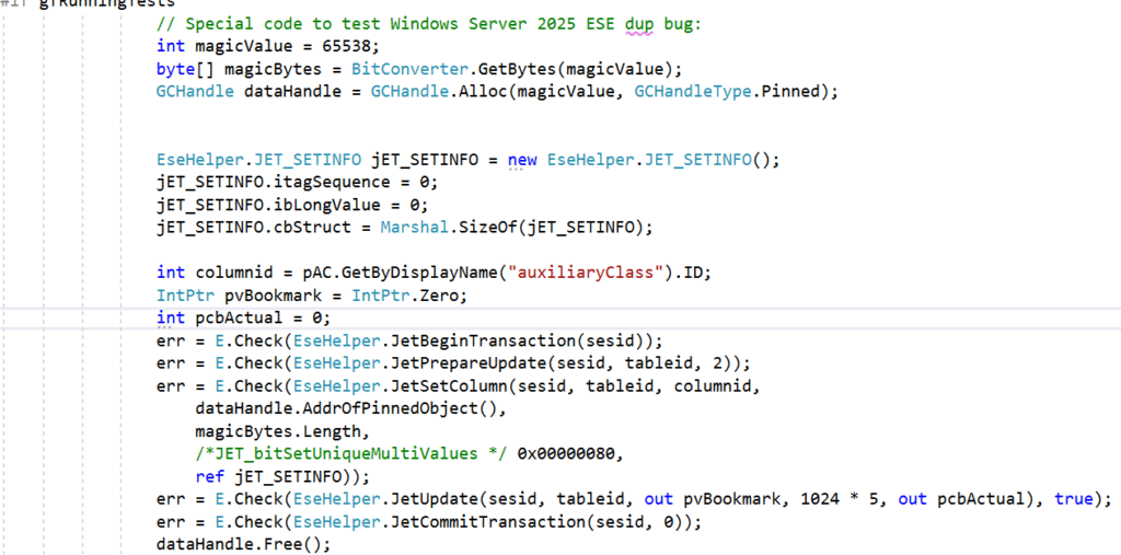 JetSetColumn is called with garbit JET_bitSetUniqueMultiValues = 0x00000080 – this seems to fail on Windows Server 2025? [2]