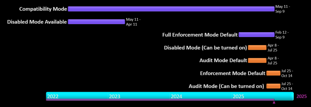 StrongCertificateBindingEnforcement has been mandatory since 10th of September 2025 with no supported way of doing a optout to Compatibility Mode. Enforcing this took over 3 years – and where still not done – while the ‘StrongCertificateBindingEnforcement’ registry key is gone from “kdcsvc.dll” with the September updates. However there is a new key available to still optout but that key is only intended for special cases and should NOT be used, but you can find it by string dumping the “kdcsvc.dll” at a specific offset.