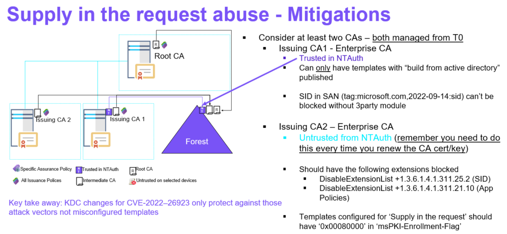 Same mitigation as presented before applies – make sure you have two enterprise issuing CAs where one of them isn’t trusted in NTAuth – this one can publish – Supply in the request (SITR) templates, while the other CA that is in NTAuth – Never should have any – Supply in the request (SITR) templates published. All and both Enterprise CAs must be managed from T0 this is very important, however they can issue certificates to lower tiers.